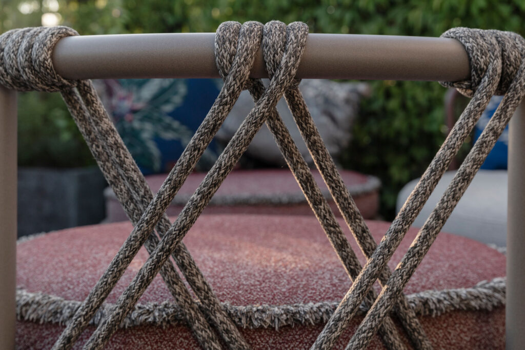 Von hier öffnet sich der Zugang zur Terrasse, die mit den außergewöhnlichen Trampolin-Sesseln von Patricia Urquiola ausgestattet ist und zu entspannten Momenten einlädt.