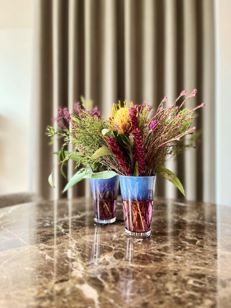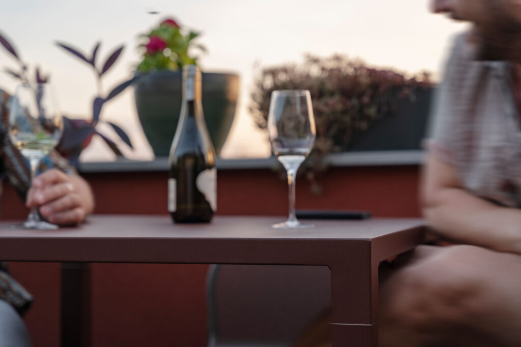 Dank der beeindruckenden Aussicht auf die westliche Skyline Wiens wurde die Sitzhöhe bewusst in Bartresenhöhe gewählt, um den ungehinderten Blick auf die Stadt zu bewahren.