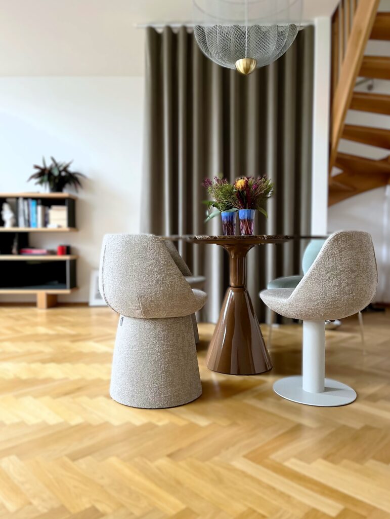 Die behutsam gestaltete Maisonette-Wohnung im 8. Bezirk, ergänzt durch eine großzügige Terrasse, bildet das Zentrum dieses Projekts. Auf der unteren Ebene setzt ein geschickt platzierter Spiegel das Sofa in Szene, erweitert optisch den Raum und schafft eine faszinierende Wechselwirkung.